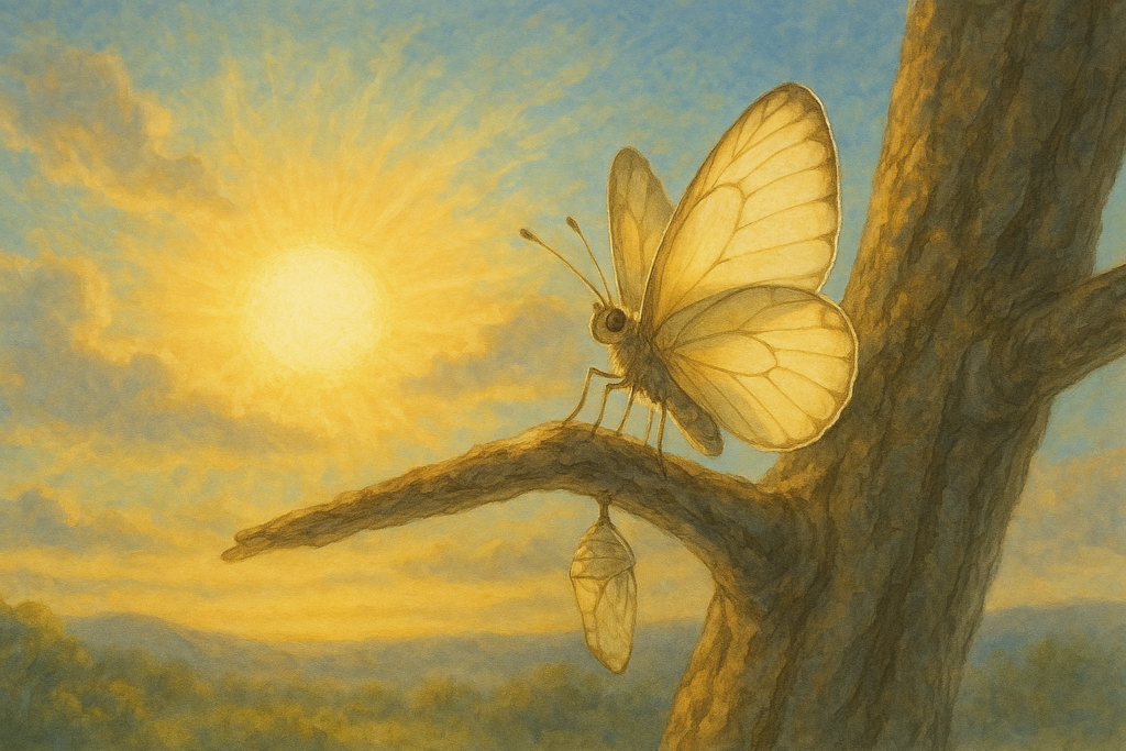 朝との境目眩し蝶生るあしたとのさかいめまぶしちょううまる作者:若 句の意味:朝の眩しさ、未来への期待は、今まさに羽化している蝶みたい