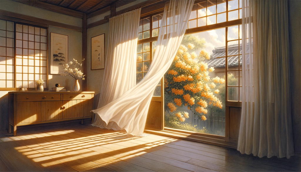カーテンの揺れては届く金木犀かーてんのゆれてはとどくきんもくせい作者:森まりも句の意味:少し開いた窓から風が入るたびに金木犀の香りが漂ってくる